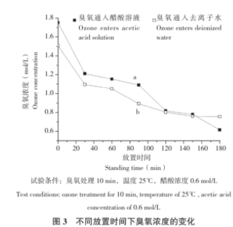 (3)配制濃度為0.6 mol/L的醋酸溶液,在25℃條件下,通入臭氧處理10 min,分別放置30、60、90、120、150、180 min,在每個放置時間后取樣測定樣品中臭氧濃度。與此同時,讓臭氧通入去離子水作對照,在一樣的溫度、臭氧處理時間以及通氣之后放置相同時間段測定樣品中的臭氧濃度。