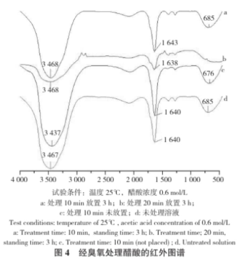 從圖3可以看出,在相同的試驗條件下,隨著放置時間的增加,醋酸溶液中的臭氧濃度急劇下降,當放置時間延長時,溶解的臭氧會有一部分揮發到空氣中,還有部分分解成氧氣,導致溶解度下降;在相同時間下,醋酸溶液中的臭氧濃度比去離子水中高,這表明臭氧在醋酸溶液溶液中比在水中更穩定,加入少量醋酸利于臭氧貯存。從圖4可以看出,臭氧處理后放置3 h的醋酸有較為尖銳的吸收峰,其譜峰3 468 cm-1、3 437 cm-1、3 467 cm-1歸屬于O-H引起的伸縮振動,譜峰 1 643 cm-1、1 638 cm-1、1 640 cm-1歸屬于C=C引起的伸縮振動,譜峰685 cm-1、676 cm-1歸屬于C-O引起的伸縮振動。而臭氧剛處理完的醋酸以及未處理的醋酸的峰值不同,說明生成的O-H鍵和C-O導致吸收峰移動,從而造成它們的峰值有所偏移。