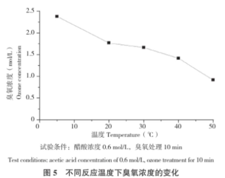 (5)配制濃度為0.6 mol/L的醋酸溶液,通入臭氧處理10 min,分別在5、20、30、40、50℃條件下取樣測定樣品中的臭氧濃度。