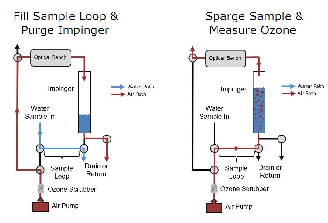 圖 1是水臭氧監(jiān)測儀的示意圖。四個 2 通閥和一個 1 通閥引導空氣和水流通過設(shè)備。測量溶解臭氧的過程包括兩個步驟。在第一步(圖 1 的左圖)中,樣品環(huán)中充滿了來自待分析水源的加壓水流,內(nèi)部空氣泵對撞擊器加壓以清空前一個樣品中的臭氧消耗水.在第二步中,改變閥門狀態(tài),使來自空氣泵/洗滌器的不含臭氧的空氣都將約 2 mL 水樣推入沖擊器并噴射樣品,富含臭氧的空氣通過光具座,其中臭氧被測量。每個步驟大約需要 5 秒,每 10 秒報告一次新的臭氧測量值。