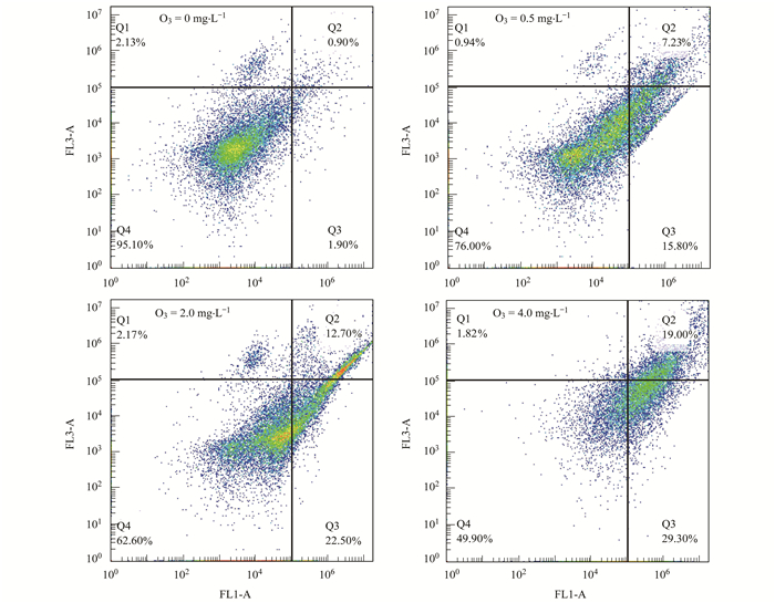 對不同臭氧濃度下BAC上的微生物凋亡特征進(jìn)行分析, 結(jié)果如圖1所示.根據(jù)兩種染色劑的熒光強(qiáng)度, 將圖內(nèi)細(xì)胞劃分為第一象限(上右象限, UR)表示晚期凋亡及死亡細(xì)胞, 第二象限(上左象限, UL)表示碎片及損傷細(xì)胞, 第三象限(下左象限, LL)表示正常細(xì)胞, 第四象限(下右象限, LR)為早期凋亡細(xì)胞.在無臭氧的條件下, BAC上微生物的存活率為95.10%, 在0.5、2.0和4.0 mg·L-1的臭氧條件下, BAC上微生物的存活率分別降至76.00%、62.60%和49.90%, 這表明臭氧會(huì)滅活部分BAC上的微生物, 這可能會(huì)減弱BAC的過濾效果.但臭氧濃度為2.0 mg·L-1時(shí), BAC的過濾效果反而提高, 這可能是微生物活性增加強(qiáng)化了生物過濾.