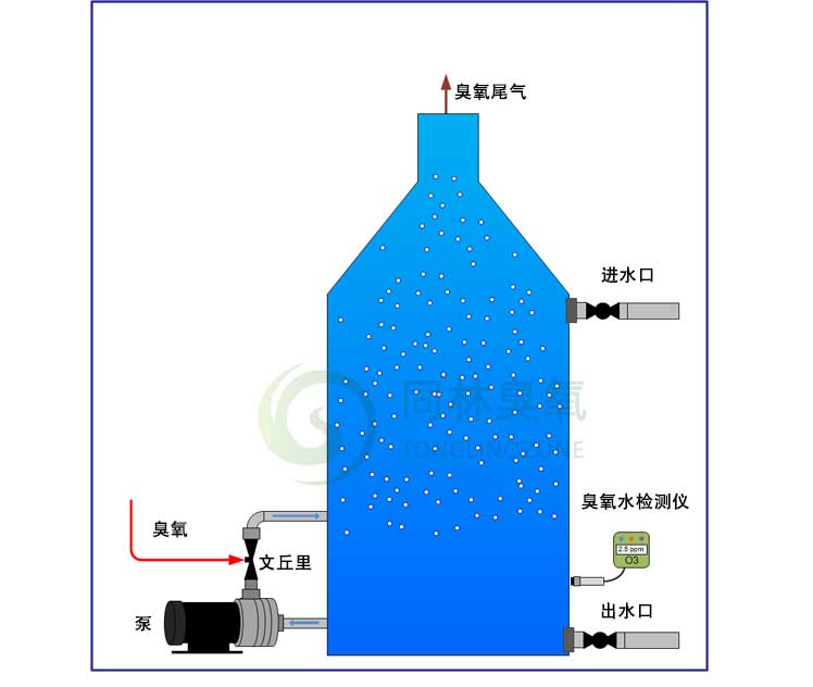 臭氧溶解與泵和文丘里噴射器是簡單的設置和相當有效。由于文丘里管的強力混合作用,這將在槽井中混合水,并比典型的氣泡擴散器實現(xiàn)更高的臭氧向水中的傳質。