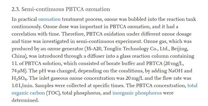 清華大學環境系使用同林臭氧發生器進行水處理實驗,撰寫了關于臭氧化降解2-膦酰丁烷-1,2,4-三羧酸(PBTCA):動力學,磷轉化,抗沉淀性能變化和除磷的論文。